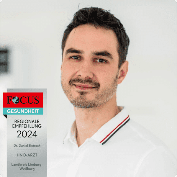 Mein Name ist Dr. med. Daniel Slotosch. Als Arzt habe ich mich auf HNO Heilkunde, Chirotherapie, Osteopathie und ambulante Operationen spezialisiert. Seit 2011 praktiziere ich mit meinem Vater Dr. Volkmar Slotosch in einer HNO-Gemeinschaftspraxis in Hadamar.